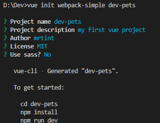 템플릿이 몇 개 없어서 참 맘에 든다. 선택장애 없이 webpack-simple 을 골랐다. quick prototyping 이 필요한 상황이니까 망설일 필요가 없다.
