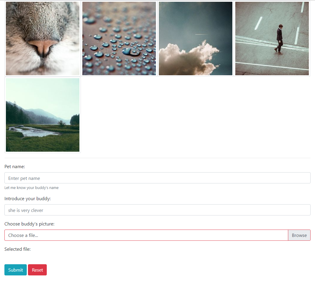 일단 사진 목록에 대한 표현의 방법은 굉장히 쉬웠습니다. 거기에 bootstrap 을 사용하는 방법이 함께 녹아져 있어서 신경써야 할 것들이 많기는 하지만 데이터를 바인딩하는 방법 자체가 굉장히 간단했습니다. 새로운 것들에 대한 배움에 대한 시간이 소비되는 것이지 구현하고자 하는 작업 자체는 굉장히 단순합니다.