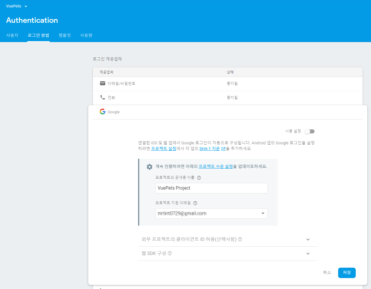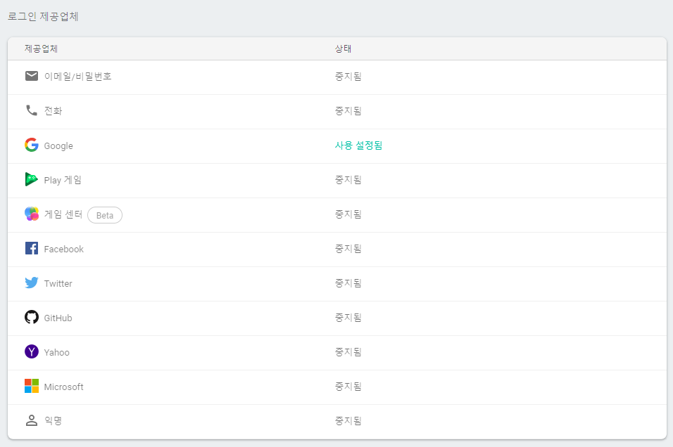- 여러 로그인 제공 업체 중에 Google 선택 및 상태를 사용 설정으로 변경