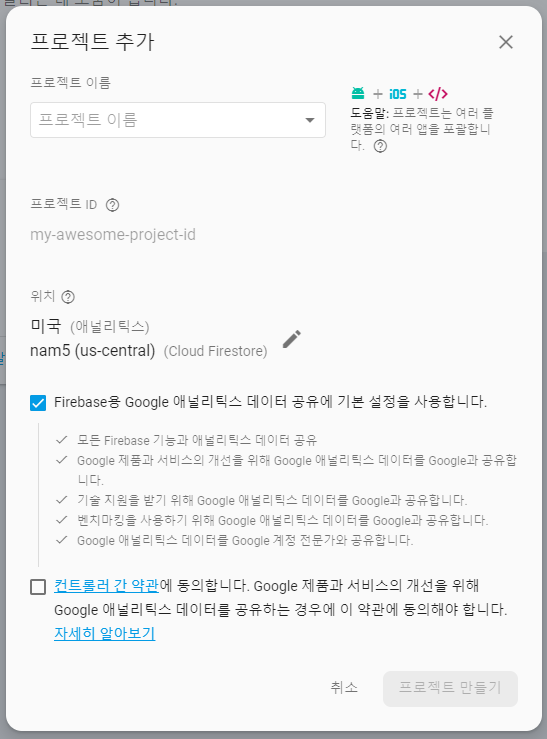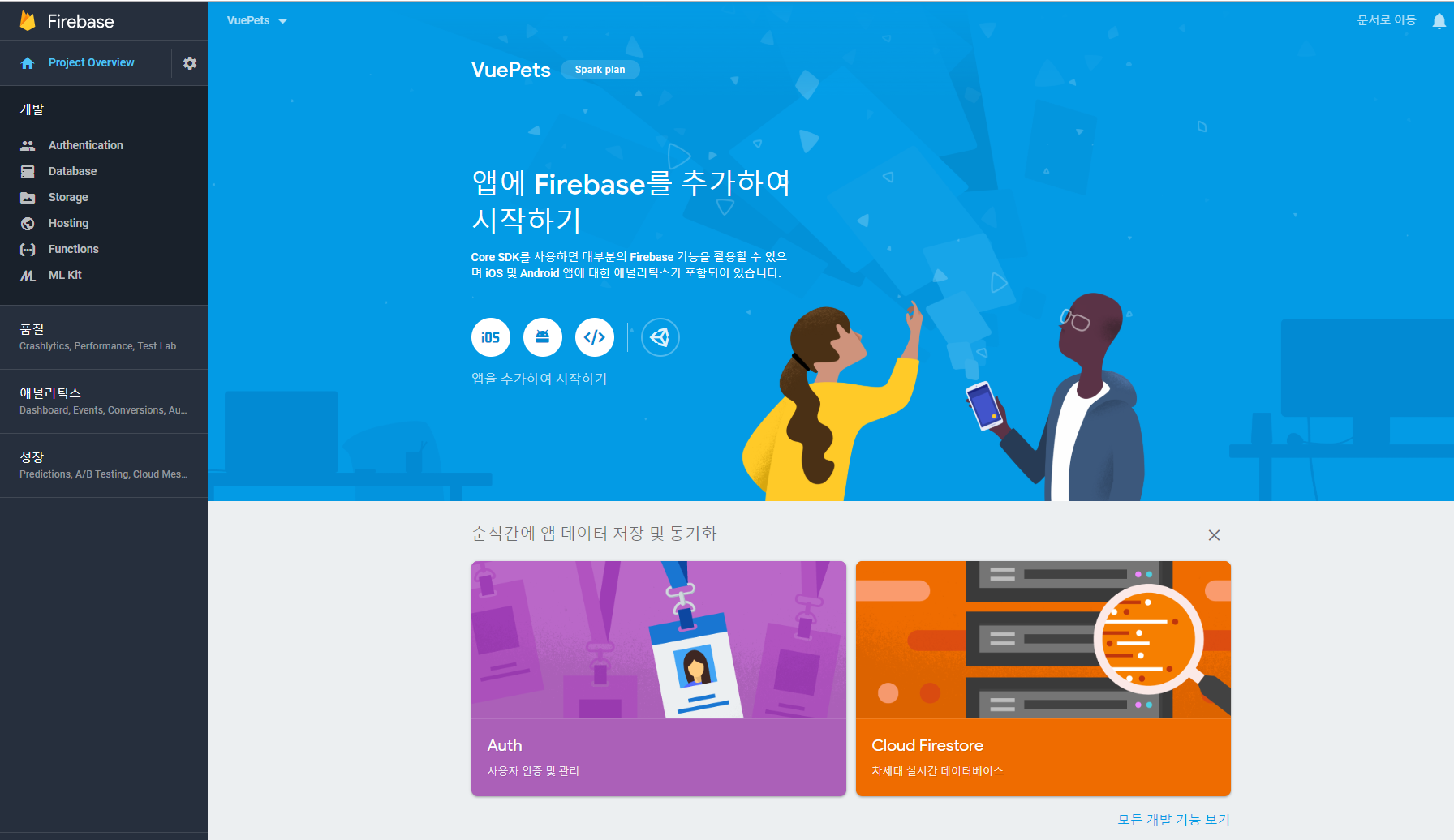 콘솔창에 접근한 후에 프로젝트 추가를 통해서 위 그림과 같은 항목을 입력한다. 그리고 프로젝트 만들기 버튼을 누르면 너무 빠르게 앱 자체를 만들 수가 있다. 이 후에 만들어진 앱 이름으로 Project overview 화면에 도착하는데, 메뉴의 모습이 몹시 단순하다. 일단 개발 항목에 있는 것들을 살짝 살펴보면, 데이터베이스와 파일 스토리지, 웹 호스팅, API, 인증 정도를 지원하고 있는 것으로 보인다. 이중에 지금 필요한 것은 '인증' 이다.
