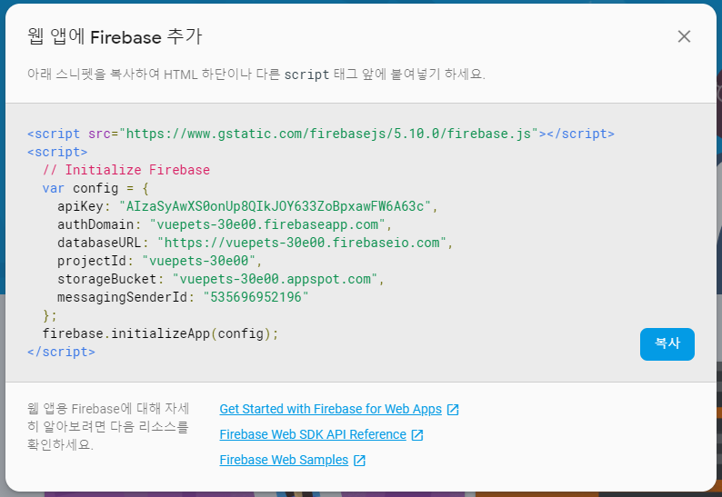 저 스크립트를 그대로 사용할 수도 있지만, 현재 구성되어있는 vue 의 형태를 최대한 따르도록 하였다. 또한 CDN의 스크립트 소스를 사용하지 않고 npm install 을 통해서 firebase 관련 라이브러리를 설치하고 사용할 수 있도록 하였다. 여기서는 몇 가지 이슈들이 있었다.